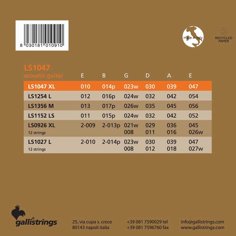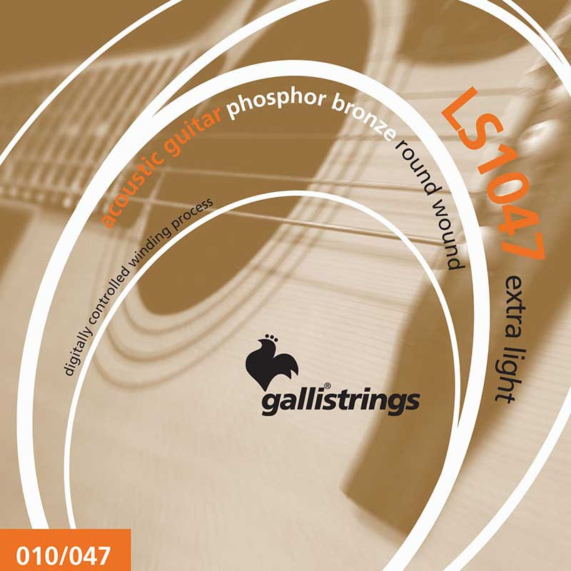 GALLI STRINGS® LUCKY STAR 12-STRINGS PHOSPHOR BRONZE EXTA LIGHT 010-047 Gallistrings® Phosphor Bronze is copper on an hexagonal core, tin and phosphor to produce a bright tone with excellent bass response..010 x2 -.014 x2 - .023 - .030 - .012 - .039 - .018 - .047 - .027