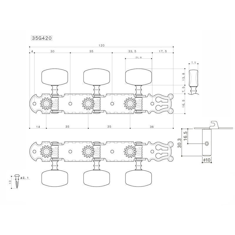 GOTOH® 35G510 SERIES MACHINE HEADS FOR CLASSICAL GUITAR IVORY BUTTONS ALUMINIUM ROLLER POSTS (1:16) X-NICKEL -Set : 2pcs -String Post : 35AR -Gear Ratio : 1 : 16 -Weight : 78.7 g/1pc (One side) -Plate Material : Hard Aluminium