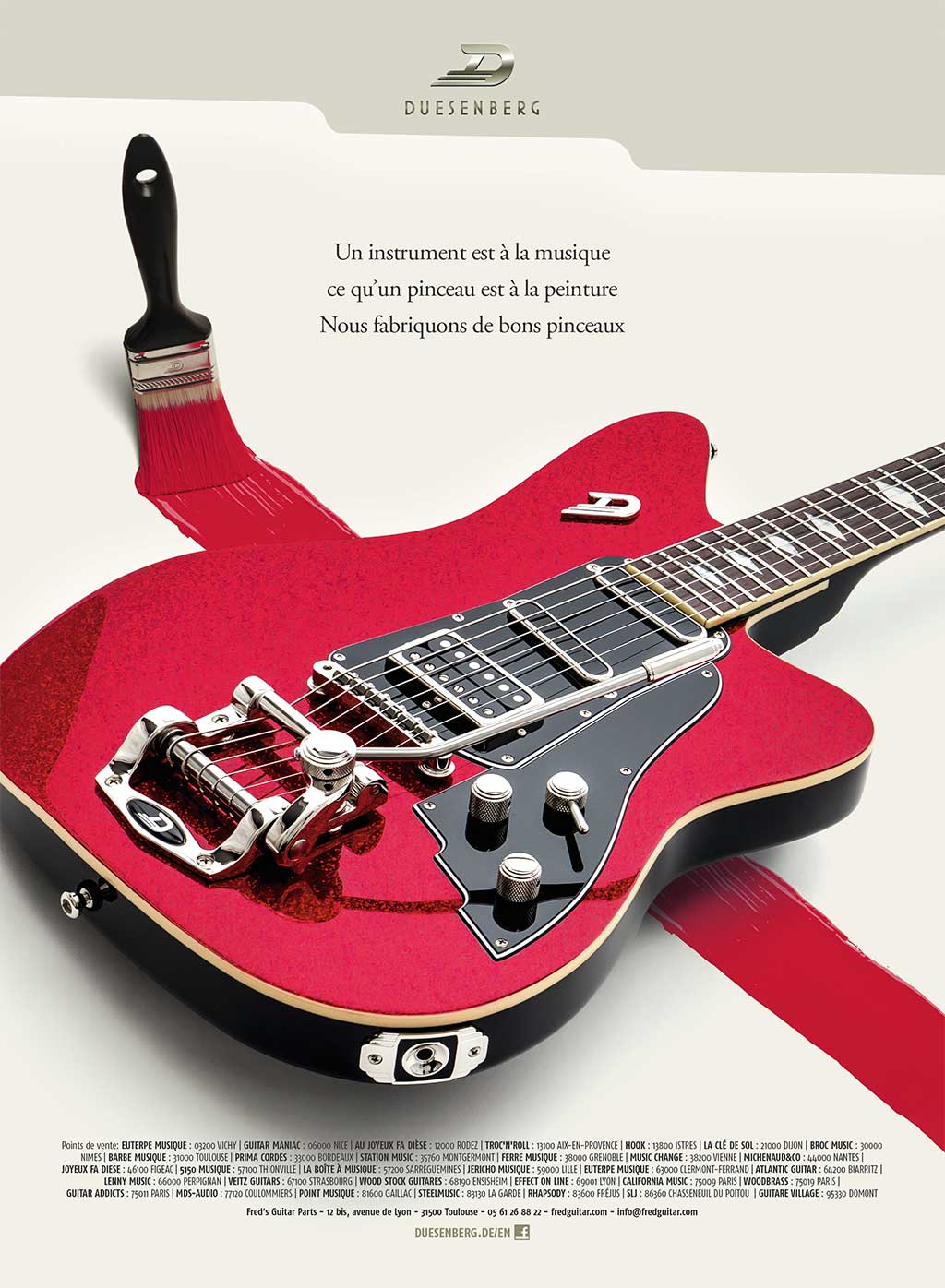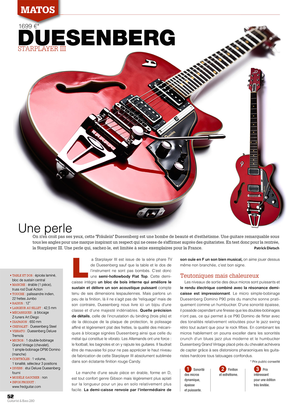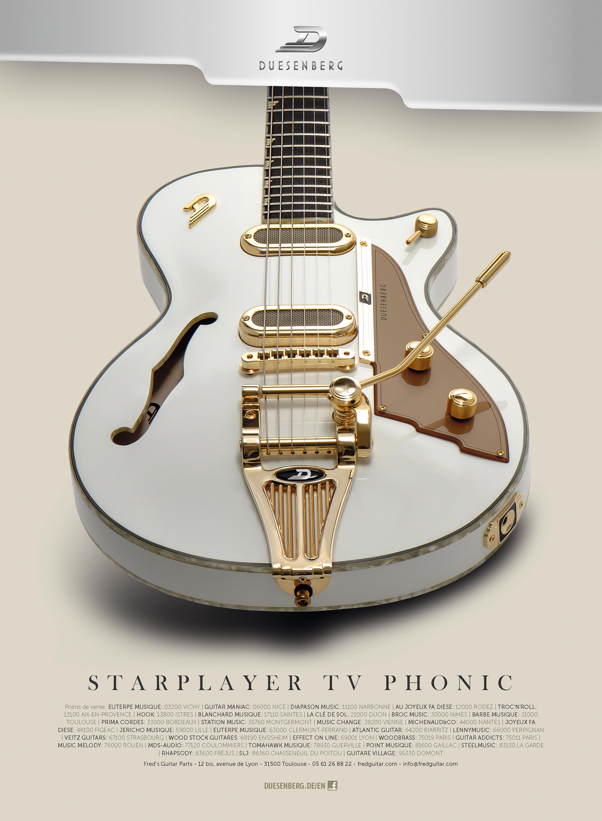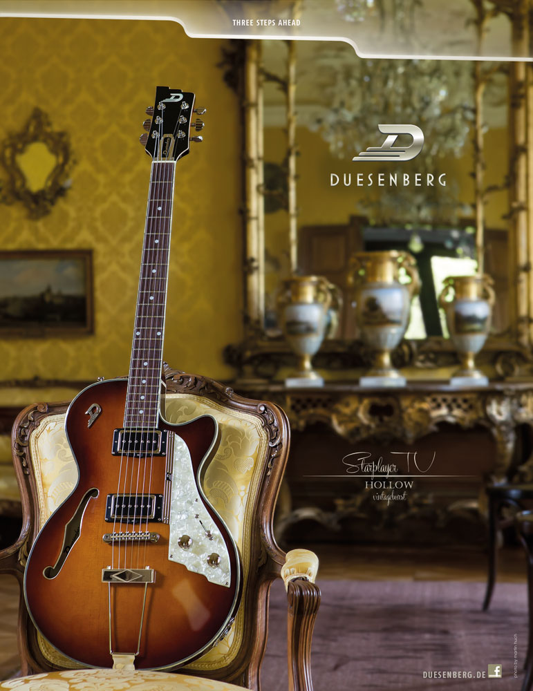 Nous regarderons vers l’est, pour une fois, du côté de l’Allemagne et de Hanovre précisément (plus réputée pour son expertise dans le domaine de la musique que dans celle du domaine skiable) avec le test de la Starplayer TV de Duesenberg. Du hors-piste quand même bien balisé : si la marque germanique est beaucoup moins connue du grand public que ses consœurs U.S, elle s’en inspire pourtant fortement, mais en ajoutant à ses instruments des petites touches vintage et « deutsche qualität » qui les démarquent des innombrables imitations sans personnalité, leur faisant au passage gagner l’intérêt de bon nombre de connaisseurs (dont Ron Wood, entre autres). Le modèle qui nous occupe ici est le « flagship », comme le veut le terme marketing consacré, de la firme, en finition Goldtop. Il est distribué depuis 2006 avec les caractéristiques techniques que nous allons vous présenter. Presque 10 ans après, il était vraiment temps d’en parler ! [...]