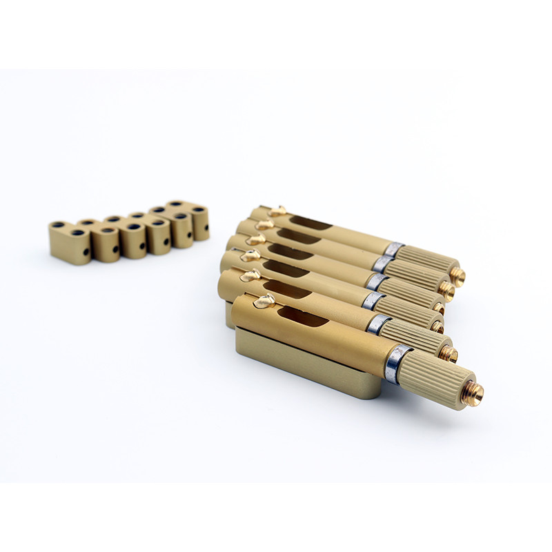 TAN BRIDGES HEADLESS GUITAR SINGLE SADDLE AND HEADPIECE SANDBLASTED GOLD Tan Bridges are made of titanium, aerospace grade aluminum and solid brass. It’s designed and produced for smooth operation, stable tuning and durability. Conventional headless bridges -which are available in the market- have friction problems due to string tension, string breaking...