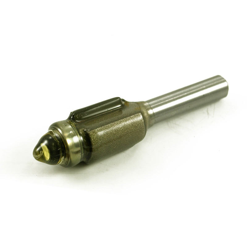 This bit is designed for the deeper cuts and features a smaller radius for tighter corners. It is custom made for us of high quality carbide with a high speed bearing and a locking collar. It will cut a maximum depth of 3/4" per pass. Bit shaft diameter = 1/4 in.