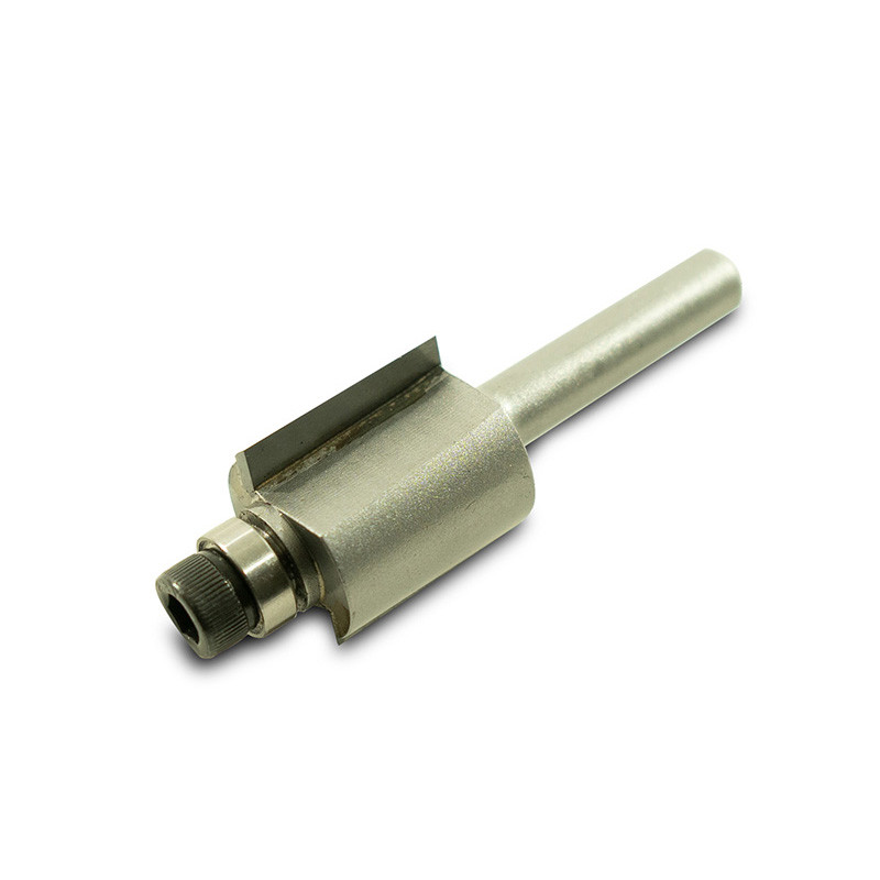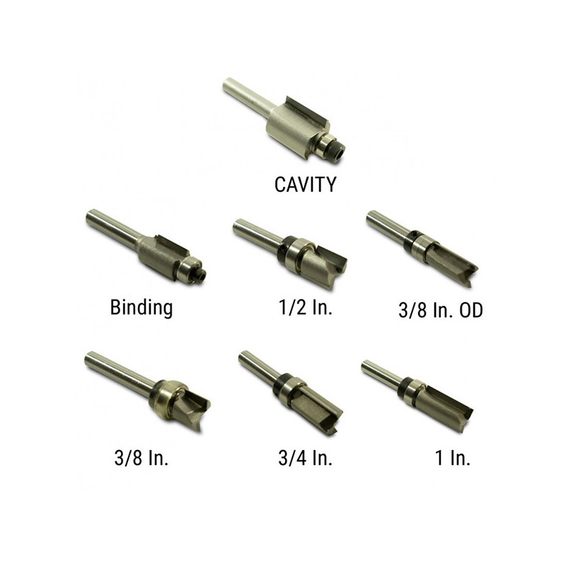 These high quality carbide bits are designed for luthier applications. Available for binding, template cuts, and control cavities. This is the standard bit. It is custom made for us of high quality carbide with a high speed bearing and a locking collar. It will cut a maximum depth of 1/2" per pass. Bit shaft diameter = 1/4 in.