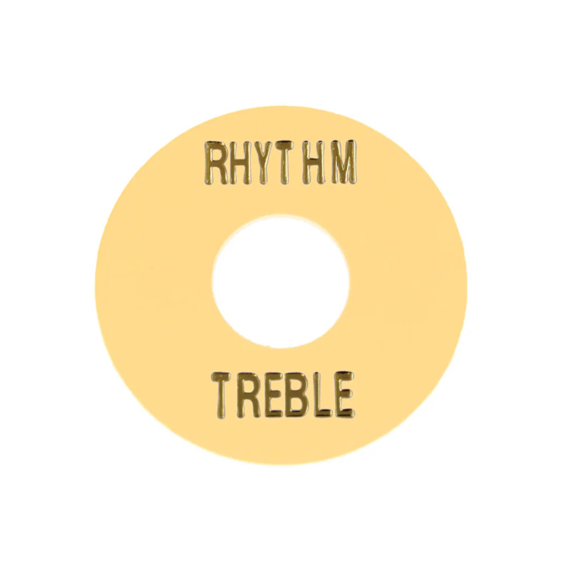 Aged cream plastic round toggle switch plate. RHYTHM and TREBLE gold letters.