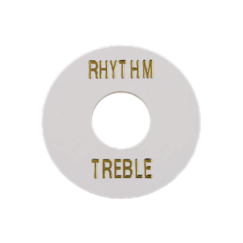 Aged cream plastic round toggle switch plate. RHYTHM and TREBLE gold letters.