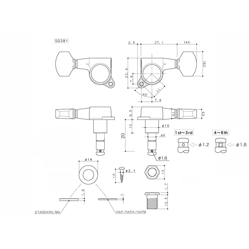 GOTOH® SG381 MG-T LOCKING MACHINE HEADS 6x1 RATIO 1:16 CHROME -Gear Ratio : 1:16 -Drill hole : 10mm
