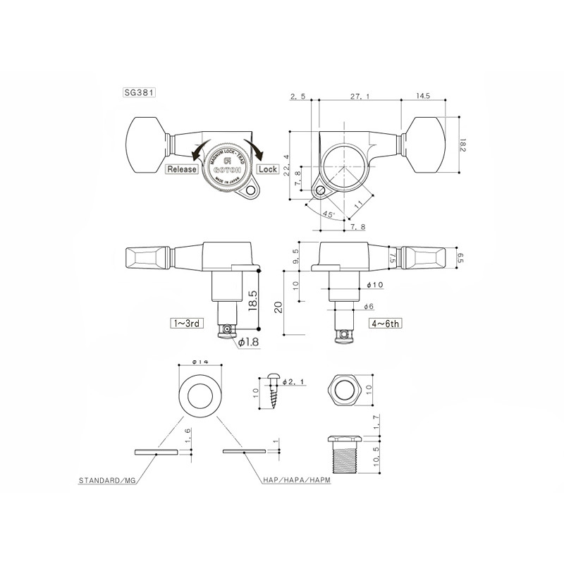 GOTOH® SG381 MG-T LOCKING MACHINE HEADS 6x1 RATIO 1:16 CHROME -Gear Ratio : 1:16 -Drill hole : 10mm