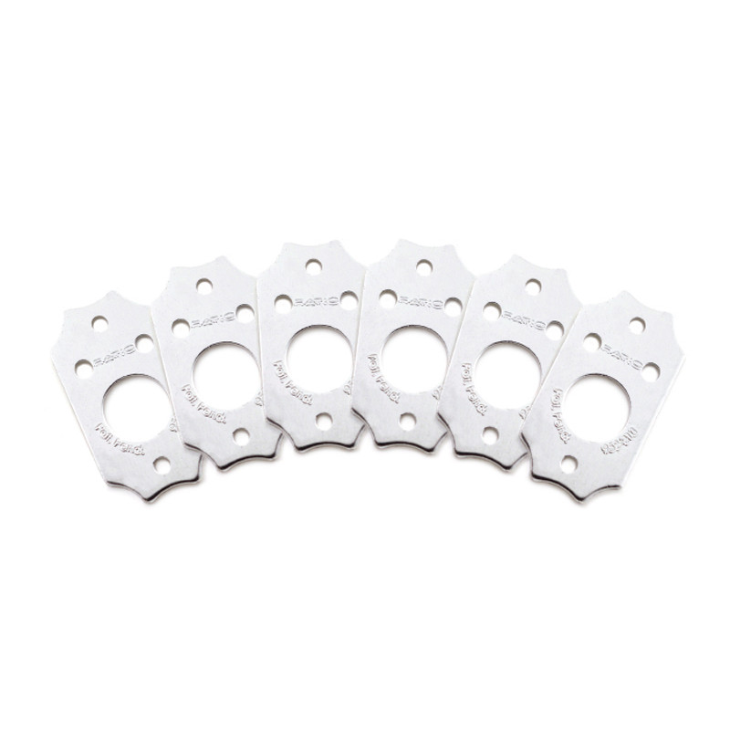 The PRT-952-214 is a set of 6 Ratio InvisoMatch Standard Installation Plates, designed for easy installation of Ratio Tuned Machine Heads. Match the correct plates to the current machine head screw position on your guitar. Use your guitars existing mounting screw holes for a fast, perfect Ratio Installation. It has a 45 degree screw hole mount.