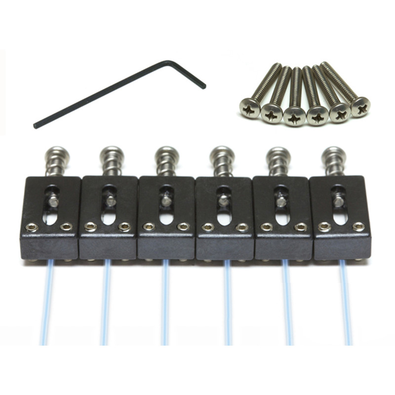 The PN-8001-00 is a set of six ghost loaded saddles with a offset intonation screw. They are designed to work with any of our ghost preamp kits. They will fit any Stratocaster or Telecaster style guitar with a string spacing of 2 1/16th. Each set of saddles come with a set of longer intonation screws for use with modern style Telecaster style guitars.