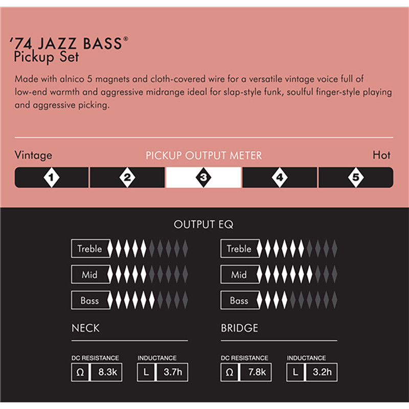 As Heard on Fender American Standard Jazz Bass guitars Fender Custom Shop Custom ’60s Jazz Bass pickups are over-wound for high output, delivering balanced midrange and low end, and classic Jazz Bass snarl and punch. Tonal Characteristics Formvar magnet wire improves overall brightness Flush-mount magnets produce even string response Alnico 5 magnets add...