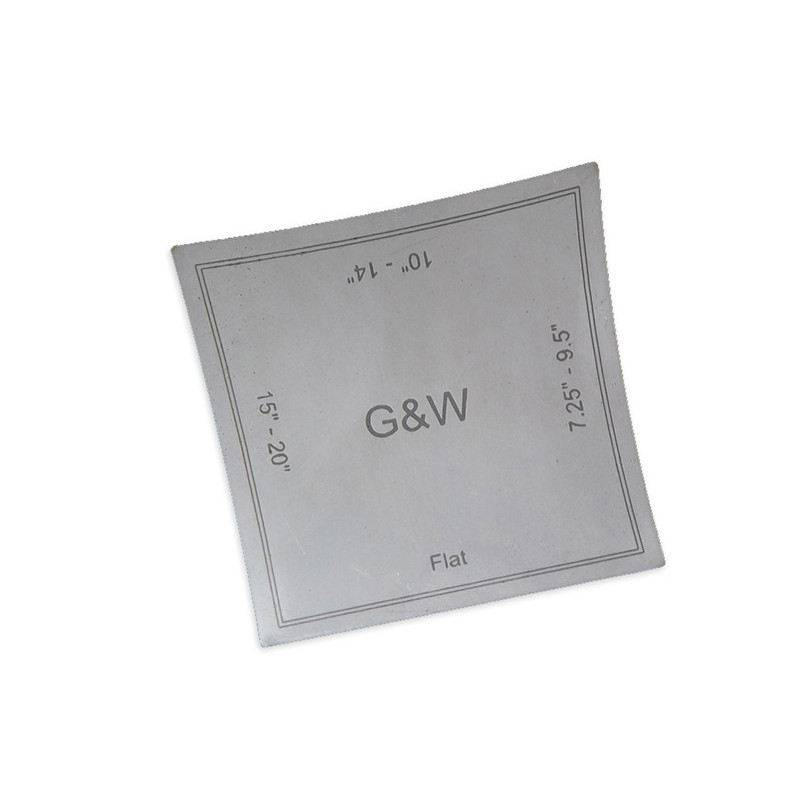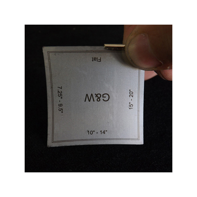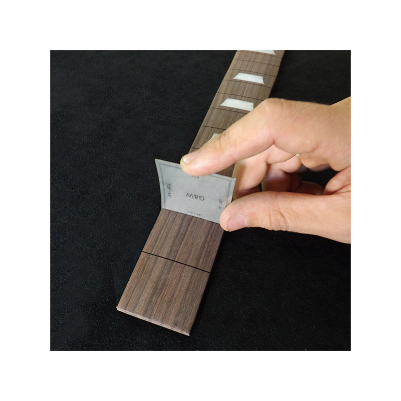 Technical data -Stainless steel 1,5mm thick - Dim100x52x1,5mm. Advantages - Two in one: high fret detector + action gauge - Handy reference: actions for electric, classical, acoustic and bass guitars - Hole for easy storage.