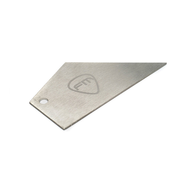 Technical data -Stainless steel 1,5mm thick - Dim100x52x1,5mm. Advantages - Two in one: high fret detector + action gauge - Handy reference: actions for electric, classical, acoustic and bass guitars - Hole for easy storage.