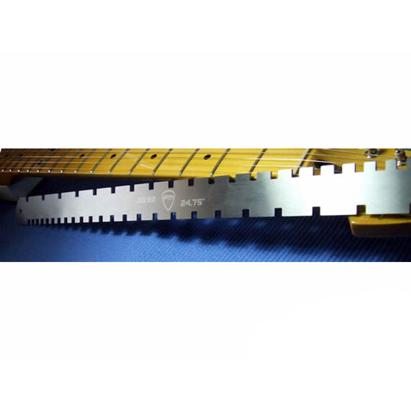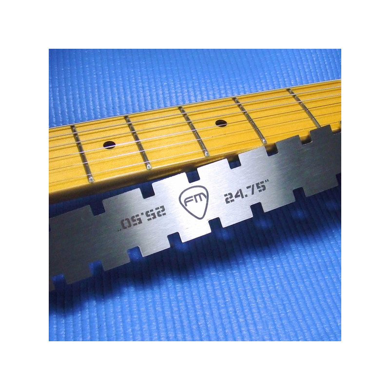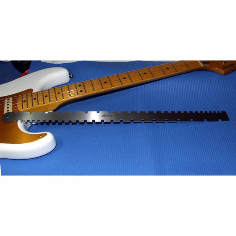 Technical data -Stainless steel 1,5mm thick - Dim100x52x1,5mm. Advantages - Two in one: high fret detector + action gauge - Handy reference: actions for electric, classical, acoustic and bass guitars - Hole for easy storage.