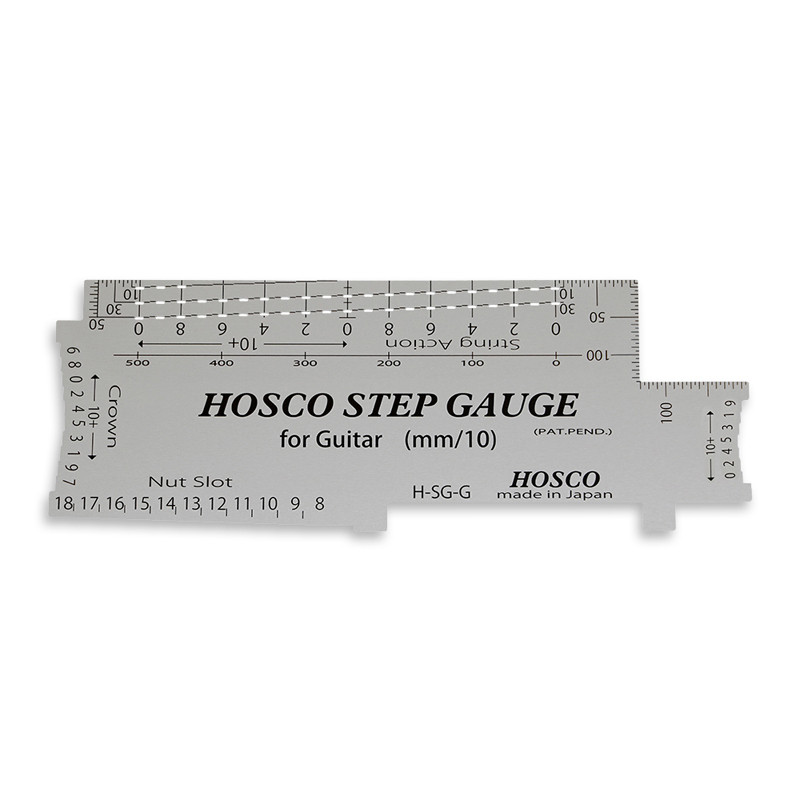 Technical data -Stainless steel 1,5mm thick - Dim100x52x1,5mm. Advantages - Two in one: high fret detector + action gauge - Handy reference: actions for electric, classical, acoustic and bass guitars - Hole for easy storage.