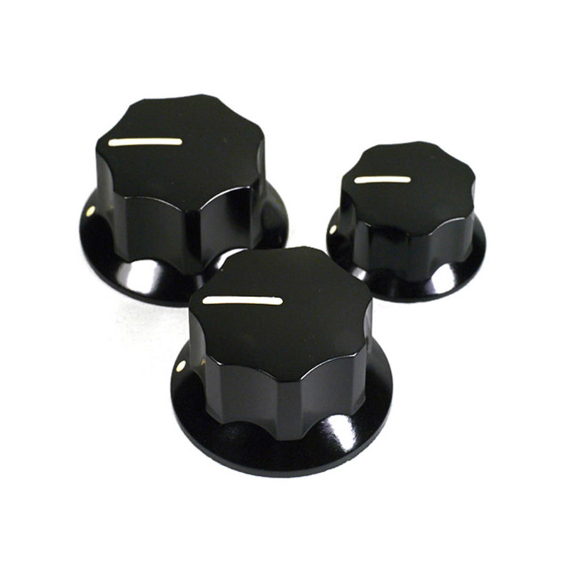 Need to replace a missing knob? Fender® has what you need straight from our U.S.-made instruments. Black plastic knob with white indicator line. Set screw mount. Designed to fit 1/4" solid shaft potentiometers. Upper knob for stacked control pot. Does not include mounting set screw or lower knob. Fits American Deluxe (US) and Deluxe Series (Mexico) Jazz...