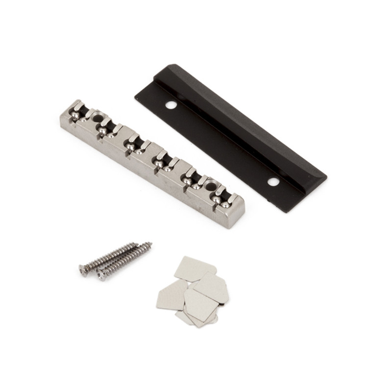 Brushed-chrome LSR roller nut assembly reduces friction that can cause tuning instability. For use on American Deluxe guitars with HSS pickup configuration; also fits older Strat Plus models with included Wilkinson® adapter. For string gauges from .008 to .056. Includes instructions, mounting hardware, shims and Wilkinson® adapter. Note that modification may be required for correct installation.