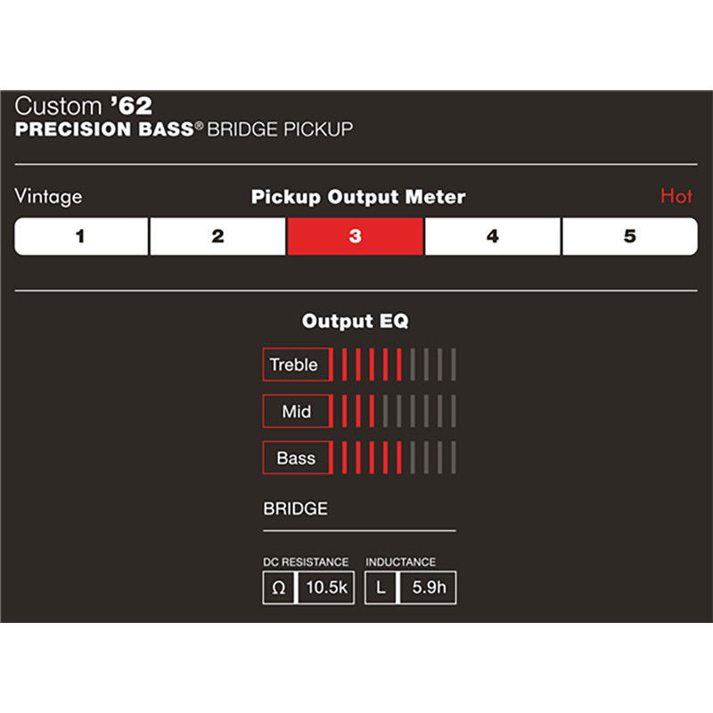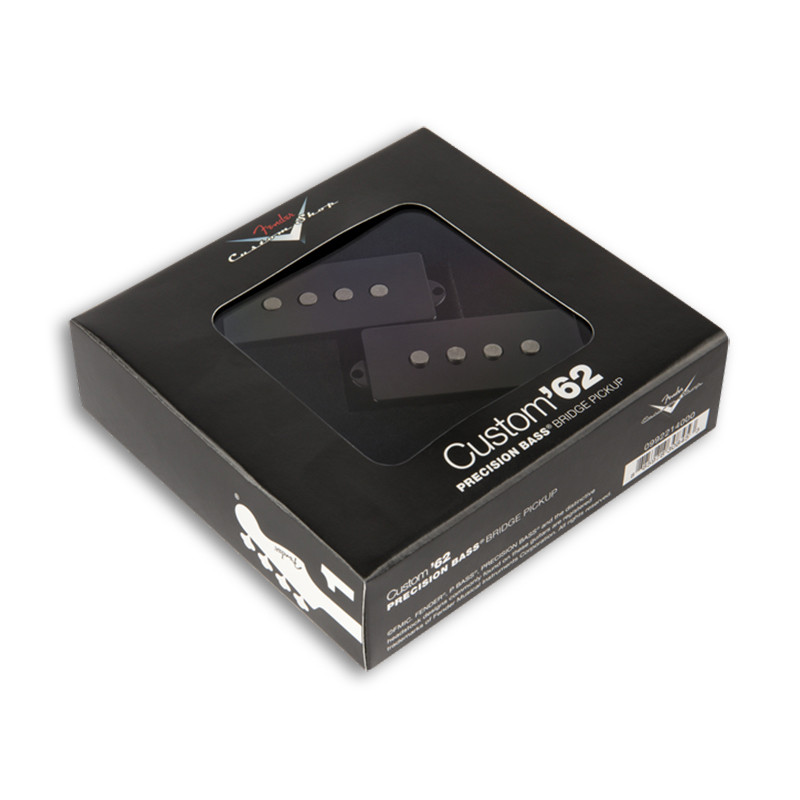 As Used on American Standard Precision Bass® Guitars (2012-Present) The Fender Custom Shop has artfully reproduced the classic 1962 Precision Bass split-coil pickup to deliver the full booming lows, punchy midrange and clear high end of the bass that started it all. Tonal Characteristics Enamel-coated magnet wire delivers warm vintage-style tones Flush-mount polepieces produce even string response Alnico 5 magnets add more focus and enhanced dynamics Product Details Period-correct cloth output wire and fiber bobbin construction Available with black pickup cover Included Components The Fender Custom Shop Precision ’62 Precision Bass pickup comes with all parts needed for installation, including: Mounting screws Pickup height adjustment tubing Wiring diagram Output Rating (Bass/Middle/Treble) 6/4/6 DC Resistance 10.5k ohms Inductance 5.9 henries Dimensions 1.50x4.75x5.00 IN Poids 0.57 LB