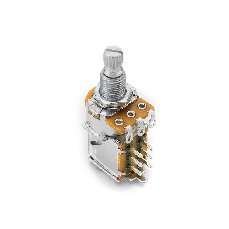 Bourns® Pro Audio PDB183 Mini Guitar Potentiometer With Push-Pull Switch ±20% Tolerance 250 kohm - Carbon element - Metal bushing - Standard Bushing 3/8 in. - Metal shaft - DPDT push-pull switch - RoHS Compliant Since these potentiometers have two separate resistance elements they are equivalent to a dual-gang potentiometer like a Fender® TBX® which has 2...