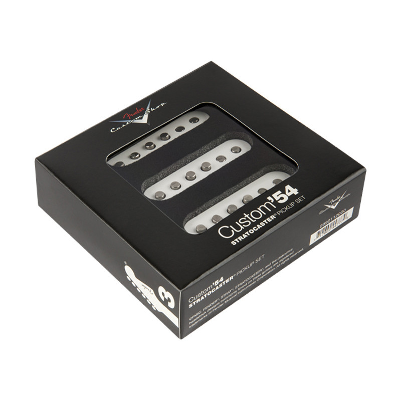 As Heard on Various Fender Custom Shop Stratocaster® guitars Our Fender Custom Shop Custom ’54 Strat pickups authentically recreate the clear tones and heightened sustain that made the Stratocaster the most revered guitar in rock history. These single-coil pickups are crafted to faithfully replicate the cutting tones reminiscent of 1954 Stratocaster guitars. Tonal Characteristics Formvar magnet wire adds brightness and glassiness. Staggered hand-beveled polepieces balance output across every string. Alnico 5 magnets add more focus and enhanced dynamics. Product Details Period-correct cloth wire and fiber bobbin construction Available with white pickup covers Included Components Fender Custom Shop Custom ’54 Strat pickups come with everything needed for installation, including: Pickups Mounting screws Pickup height adjustment tubing Wiring diagram Output Rating (Bass/Mid/Treble) Neck/middle: 3/4/3 Bridge: 6/4/3 Other Specifications DC Resistance: Neck/middle: 5.9k ohms Bridge: 6.5k ohms Inductance: Neck/middle: 2.4 henries Bridge: 2.75 henries Dimensions 1.50x5.00x5.25 IN Poids 0.65 LB