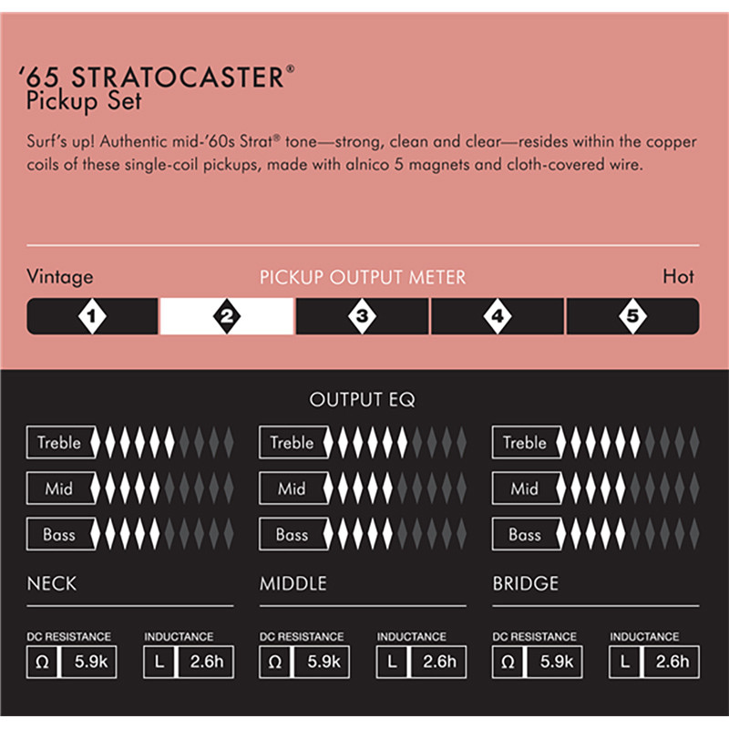 Fender American Vintage ’65 Stratocaster® guitar No other pickups give you the powerful, clean and clear surf rock tones of mid-’60s Stratocaster guitars like dutifully constructed, meaty-sounding Pure Vintage ’65 Strat pickups. Enamel-coated magnet wire delivers warm vintage-style tones Alnico 5 magnets add more focus and enhanced dynamics Staggered polepieces balance volume and output across every string Wax-potted Period-correct cloth wire and fiber bobbin construction