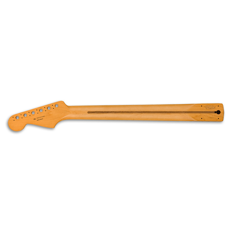Crafted at our Ensenada, Mexico manufacturing facility, this genuine vintage-style Fender Stratocaster® guitar neck features a comfortable "Soft V" profile and 9.5"-radius maple fingerboard with 21 medium jumbo frets. The synthetic bone nut is pre-slotted with "pilot" string location grooves to make spacing a breeze when performing the final string slot...