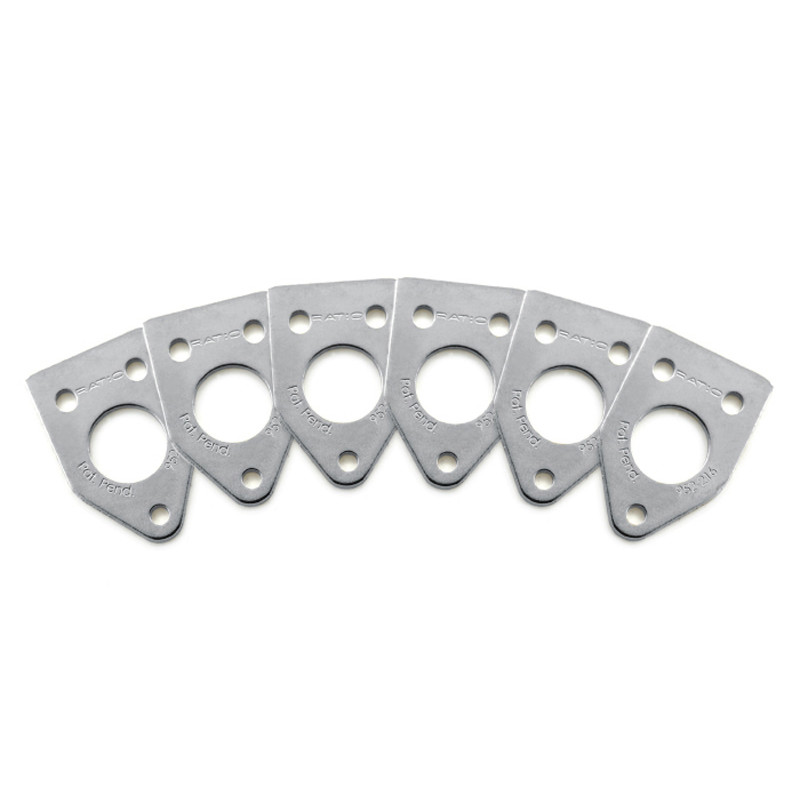 The PRT-952-214 is a set of 6 Ratio InvisoMatch Standard Installation Plates, designed for easy installation of Ratio Tuned Machine Heads. Match the correct plates to the current machine head screw position on your guitar. Use your guitars existing mounting screw holes for a fast, perfect Ratio Installation. It has a 45 degree screw hole mount.