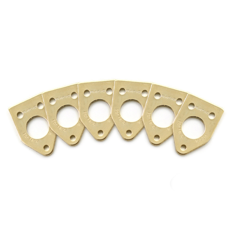 The PRT-952-214 is a set of 6 Ratio InvisoMatch Standard Installation Plates, designed for easy installation of Ratio Tuned Machine Heads. Match the correct plates to the current machine head screw position on your guitar. Use your guitars existing mounting screw holes for a fast, perfect Ratio Installation. It has a 45 degree screw hole mount.