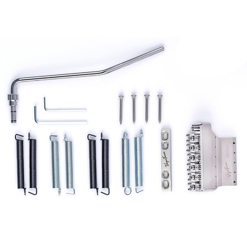 This vintage tremolo has remained virtually unchanged since the creation of the Stratocaster®. Fender® stamped saddles and six mounting screws define the vintage tone of this tremolo assembly. Includes six saddle bridge assembly, tremolo claw, tremolo tension springs, tremolo arm, tremolo arm tip, tremolo arm tension spring, string tree, .050 hex...
