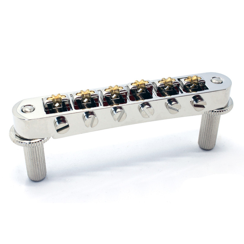 BRIDGE ABR-I STYLE FOR VINTAGE LES PAUL® WITH WIRE NICKEL -Bridge Material : Zinc -Saddles Material : Brass (No Notch) -String Spacing : 10.4mm (E-e : 52mm) -Studs Spacing : 74mm