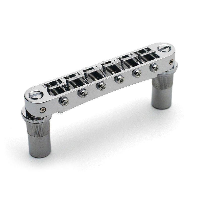 BRIDGE ABR-I STYLE FOR VINTAGE LES PAUL® WITH WIRE CHROME -Bridge Material : Zinc -Saddles Material : Brass (No Notch) -String Spacing : 10.4mm (E-e : 52mm) -Studs Spacing : 74mm