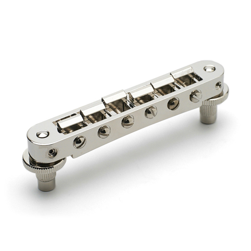 BRIDGE ABR-I STYLE FOR VINTAGE LES PAUL® WITH WIRE NICKEL -Bridge Material : Zinc -Saddles Material : Brass (No Notch) -String Spacing : 10.4mm (E-e : 52mm) -Studs Spacing : 74mm