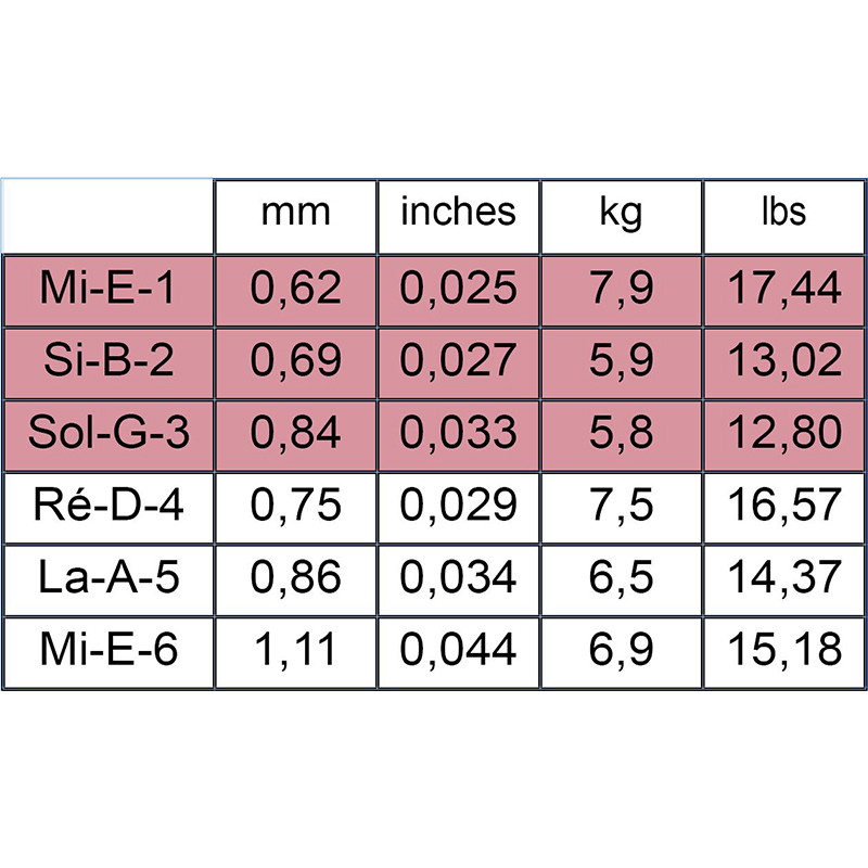GALLI STRINGS® CLASSIC HARD TENSION Les cordes LA GALLI sont composées d'un monofilament de nylon cristal pour les aigus et d'un filetage en cuivre plaqué argent multifilament pour les basses. Un son homogène et puissant et une intonation parfaite pour une performance maximale! .029 - .033 - .041 - .030 - .038 - .045