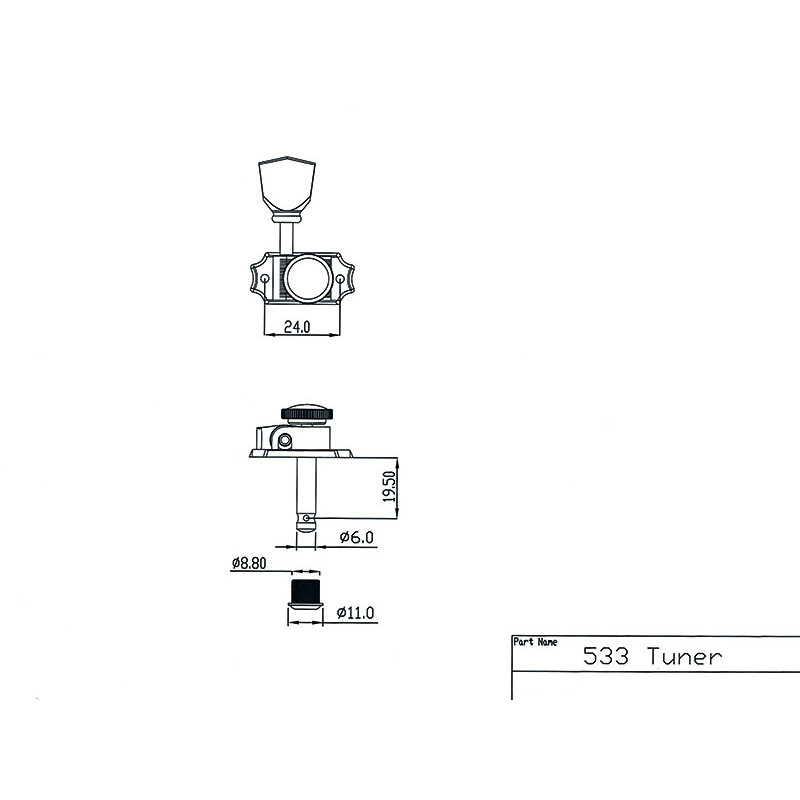 GOTOH® SD90 MACHINE HEADS ROUND BUTTON 3+3 RATIO 1:15 NICKEL -Gear Ratio : 1:15 -Bushing Diameter 8.8mm -Button : 05M
