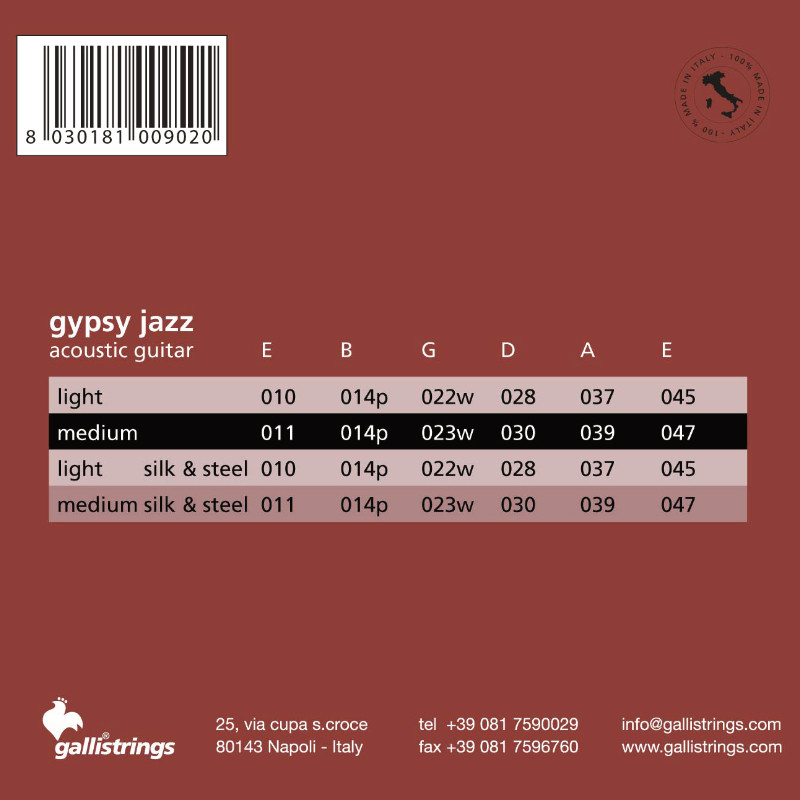 GALLI STRINGS® GYPSY JAZZ SILK & STEEL MEDIUM 011-047 (BALL) Les cordes GalliStrings® GYSPSY JAZZ sont désignées spécialement pour les guitares manouches, leur filage rond plaqué argent en font une corde douce mais qui ne manquent pas d'attaque.(à boule) .011 - .014 - .023 - .030 - .039 - .047