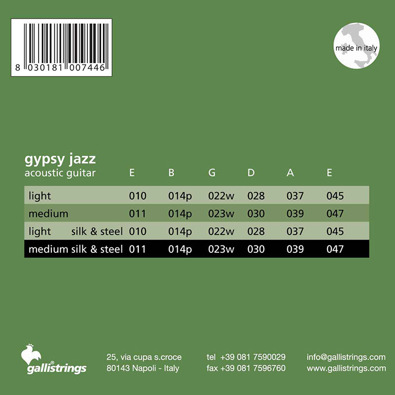 GALLI STRINGS® GYPSY JAZZ SILK & STEEL MEDIUM 010-045 (BALL) Les cordes GalliStrings® GYSPSY JAZZ sont désignées spécialement pour les guitares manouches, leur filage rond plaqué argent en font une corde douce mais qui ne manquent pas d'attaque.(à boule) .010 - .014 - .022 - .028 - .037 - .045