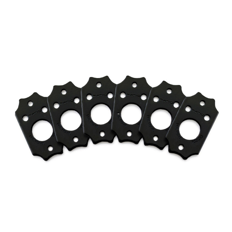 The PRT-952-214 is a set of 6 Ratio InvisoMatch Standard Installation Plates, designed for easy installation of Ratio Tuned Machine Heads. Match the correct plates to the current machine head screw position on your guitar. Use your guitars existing mounting screw holes for a fast, perfect Ratio Installation. It has a 45 degree screw hole mount.