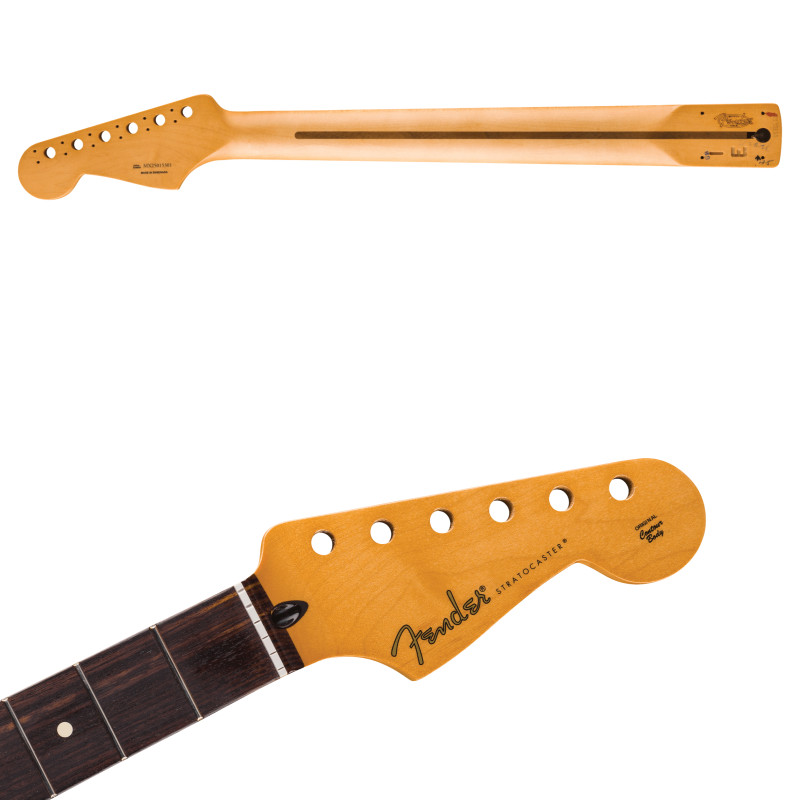 Crafted at our Ensenada, Mexico manufacturing facility, this genuine vintage-style Fender Stratocaster® guitar neck features a comfortable "Soft V" profile and 9.5"-radius maple fingerboard with 21 medium jumbo frets. The synthetic bone nut is pre-slotted with "pilot" string location grooves to make spacing a breeze when performing the final string slot...