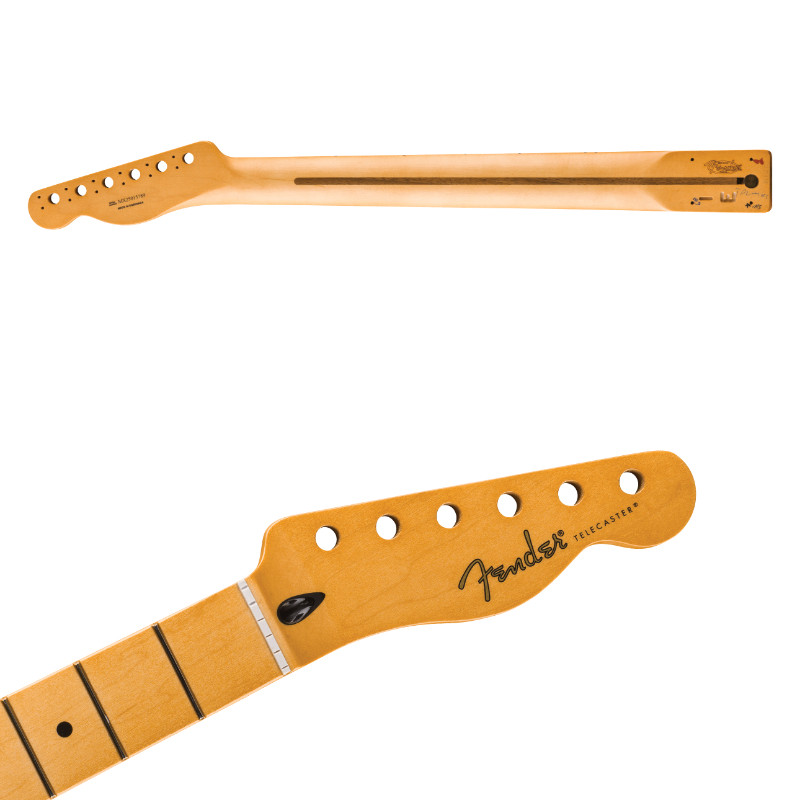 Crafted at our Ensenada, Mexico manufacturing facility, this genuine vintage-style Fender Telecaster® guitar neck features a substantial 1951 "U"-shaped profile and 9.5"-radius maple fingerboard with 21 6105 frets. The synthetic bone nut is pre-slotted with "pilot" string location grooves to make spacing a breeze when performing the final string slot...